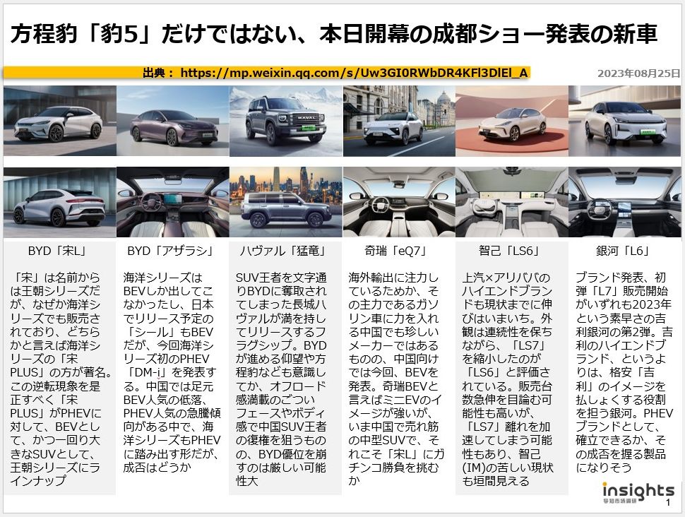 2023年08月25日(金) 編集 方程豹「豹5」だけではない、本日開幕の成都ショー発表の新車 [Electric] タグ :#成都#モーターショー#BYD#王朝シリーズ#海洋シリーズ#長城汽車#ハヴァル#Chery#智己汽車#Geely 成都モーターショーが2023年8月25日、開幕する。中国現地の自動車業界では成都ショーの話題で持ちきり。各社とも力を入れている。その中で注目なのはBYDの新ブランド「方程豹」でその初弾「豹5」が対外的に正式に発表されるものの、新車発表はもちろんそれだけではない。今回さまざまな思惑ある6車種を厳選した。
